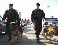 Policemen use sniff dogs to check cars parked in the square to ensure security of the National People's Congress annual meeting on March 5.
