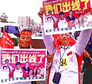 A nervous Chinese display and cold drizzle did nothing to dampen the enthusiasm of 60,000 fans who packed the stadium in Shenyang, many sporting red headbands and painted faces, and banging drums.
