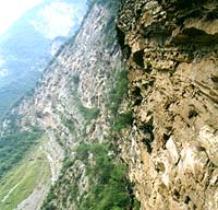 Others say the plank road was developed simply for people to pass. If this were true, one line of holes would be enough to hold wooden boards, but two lines of holes were found in many places. Why? If as someone supposed the upper row was used for a canopy, why was the space between the upper and lower holes not enough for a person to stand erect? What's even stranger is that some holes were dug under the cliff while there was enough space in a comparatively safe place. If people wanted to pass the road, they would need to crawl over. In some other places, a slope had been made ready, but why would people still dig out plank roads on the cliff?