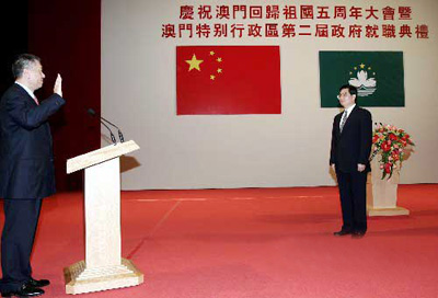 With Hu administering, Edmund Ho Hau Wah was sworn in as the second-term chief executive of the Macao SAR.