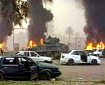 Initial video of the aftermath showed three vehicles engulfed in flames, and several Iraqi civilians lying on the ground, bloodied. US troops and tanks were on the scene and gunshots could be heard in the background.