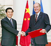 Hu hailed the sound development of Sino-French relations and called on all peace-loving peoples and nations in the world to join hands in safeguarding world peace and promoting common development.
