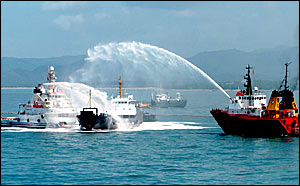 The drill started at 9:00 am with a simulated collision between two cargo ships in the South China Sea, which sank one ship and caused the other to catch fire and leak 50 tons of oil.