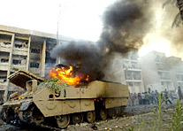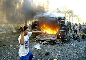 Witnesses said the casualty toll climbed when US helicopters fired at a crowd gathering around a burnt US tank in the area.  Mazen al-Tomizie, a 26-year-old Palestinian journalist working for Dubai-based al-Arabiya TV was killed as he was reporting live from the scene, a colleague said.