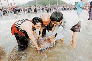 This year, 120 fishermen dressed in ancient costumes carried a big bowl of wine to the beach, followed by a dozen people carrying three jars of jujubes, walnuts and peanuts. They bowed to the sea and poured the wine and food into the water.