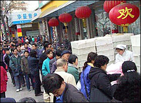 People queued up outside the Daoxiangcun Foodstuff Group’s Dengshikou store in Beijing to buy yuanxiao, or rice dumplings, on Saturday. The company’s Andingmen store sold six tons of the sweet treats that day.
