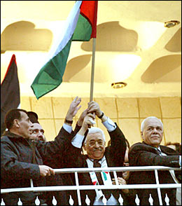 Militants fired into the air and thousands of Abbas' supporters took to the streets, waving Palestinian national flags and pictures of Arafat and Abbas.