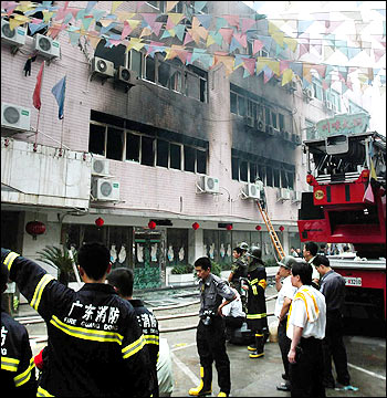 The fire broke out around 12:20 at Friday noon and engulfed the top three floors of the four-story Huanan Hotel, which is located in a downtown district of Shantou City, local police said earlier.