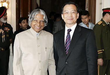 Visiting Premier Wen Jiabao (R) meets with Indian President A.P.J. Abdul Kalam in New Delhi April 11, 2005.