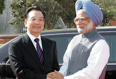 Visiting Premier Wen Jiabao (L) shakes hands with Indian Prime Minister Manmohan Singh during a welcoming ceremony in New Delhi April 11, 2005.