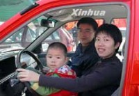 Three members of an urban family sit in a mini car on an auto show Sunday, in Fuzhou, capital city of southeast China's Fujian province, November 25, 2001.