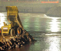 Construction workers are progressing steadily in damming the diversion channel of the Three Gorges Power Project, a crucial phase in the construction of the giant project.