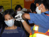 The passengers, most of them also wearing face masks, queued inline for their turn. Speakers in the station hall broadcast in Mandarin, Cantonese and English saying that all passengers arriving in Hong Kong must have their body temperature measured beginning Thursday, an effort undertaken by the Hong Kong Special Administrative Region government to curb the spread of Severe Acute Respiratory Syndrome (SARS).