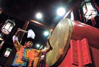 Yesterday, the tradition resumed. A group of teen-age martial arts students climbed the steep stone stairs of the Drum Tower and beat a set of drums which are up to 1.6 meters across as the bell in a nearby tower rings.