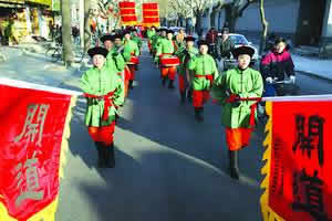 A troop of escorts and musicians, playing happy music, escorted the bride to the bridegroom's home. Marching across the Beihai Park, the escorting team attracted lots of visitors in the park.
