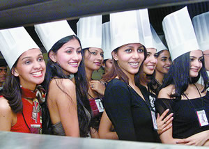 Contestants for Miss India 2003 wearing chef hats assemble in a kitchen in Bombay this week. They were given cooking lessons as part of their preparation for the beauty contest, which will take place next month.