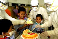 Medical workers cut pieces of cake for SARS children in Beijing Ditan Hospital May 30, 2003. Medical workers of the hospital sent gifts to SARS children Friday, wishing them early recovery and happy children's day.