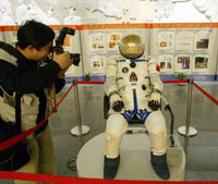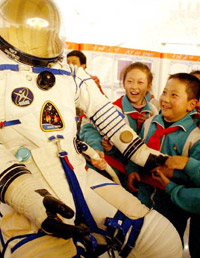 The astronaut's son led a dozen of the young students in a performance of an imitation space launch at the exhibition hall, with the televised scene of the space mission as the background. The audience cheered at the children's performance.