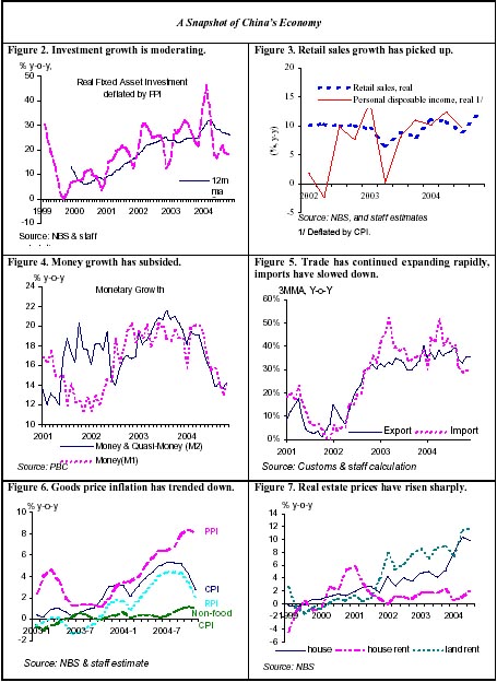 The macroeconomic outlook for 2005 remains favorable, with a supportive external environment, prospects of robust domestic demand growth, and waning underlying inflation pressures. In these circumstances, policymakers are rightly putting emphasis on institutional and structural reforms. The December Central Economic Work Conference formulated directions on macroeconomic management, public finances, and institutional and structural reforms. The announced switch from a "proactive" to a "prudent" monetary policy stance likely reflects the authorities' willingness to increase interest rates if warranted. Announced further interest rate reforms could improve rural finance and resource allocation. The fiscal deficit target for 2005 remains largely unchanged from last year's outcome, whereas the announced increase in government spending on public goods and services, especially in poor rural regions, could improve equity and increase consumption. Several worthy tax reforms are under consideration, including unification of enterprise income tax regimes and a fuel tax. To reduce the tendency of over?investment and improve the use of land, urban finance, the intergovernmental fiscal system, and the performance monitoring system for local governments are in need of reform.