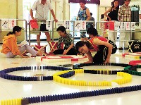 The employees were practicing for a mall-organized show in which 1,000,000 dominoes will be used to form a 350-squre-meter figure to celebrate Beijing’s selection as host city for the 2008 Olympic Games.
