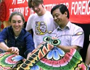 Ha Yiyu, a craftsman in Beijing, teaches Anna Leweis (L) and Yoni Tressman (C) how to make a kite at the opening ceremony of a contest for foreigners to learn how to produce Chinese handicrafts. It was held Thursday in the Wangfujing Arts and Crafts complex in Beijing and more than 70 foreigners participated in the event.