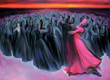 Throughout history clouds have represented soul, happiness, freedom and struggle. In Liu's Passion of Cloud and Soul's Up and Down, the audience is presented with clouds of purple and blue, stretching into a vast distance. The skybound forms seem almost to move within the frame, as if there may be a soul within, struggling to escape. In The Wings, gray clouds are background to red wings poised to uplift, representing the yearning for freedom and true expression. In A Girl's Dream, audiences detect Liu's own image. She integrates her passion into her works, into the red clouds, and expresses love for the young girls beneath the sky.
