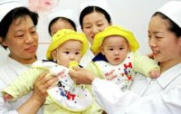 Nurses hold the twin-brothers Tu Kang and Tu Jian to say good bye at the No. 1 Hospital attached to the Fujian Medical Sciences University in Fuzhou, capital of south China’s Fujian Province April 9, 2001.