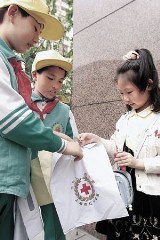 Qiu Yi (right in the photo), a primary school student from Shanghai, donates money to help children suffering from leukemia. The girl is responding to an activity organized by Xiuhui District Red Cross of Shanghai to mark the World Red Cross Day today.