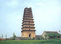 The existing pagoda is the original structure erected thirteen hundred years ago. It was built on a square plan, with each side of the first storey measuring 9.5 meters long. The first storey on its square pedestal is huge; all eleven storeys reach a height of thirty-three meters. The steeple has been destroyed. At the entrance of the pagoda is an inscription made during Qianlong's reign in the Qing Dynasty. One characteristic of the pagoda is that the storeys are higher than those of ordinary multi-eave pagodas. Also, the pillars, beams, brackets and window lattices are painted red, a rare sight among multi-eave pagodas,