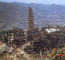 The octagonal, nine-storey, brick pagoda is forty-four meters high. Doors on the south and north sides of the first storey are inscribed respectively with, "Looking down upon the world," and "Rising up into the sky," which give justice to the majesty of the pagoda. A spiral staircase inside the pagoda allows people to go to the top for a bird's-eye view of the city.