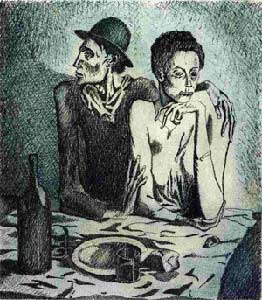The 1904 etching representing a destitute couple, is an important work from Picasso's "blue period".