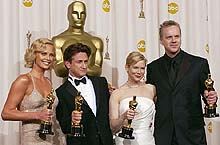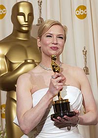 Zellweger won for playing a character in frumpy clothes and a layer of dirt from working the fields, a year after Cold Mountain co-star Nicole Kidman received the lead-actress Oscar for wearing a fake nose to simulate Virginia Woolf's plain-Jane features in The Hours. And best-actress winner Theron, in Monster, gained 30 pounds and was disguised behind dark contact lenses, false teeth and splotchy makeup.