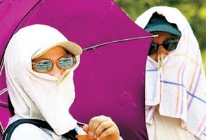 Women protect themselves against scorching temperatures in Nanjing City in the eastern province of Jiangsu on Tuesday as the maximum temperature reached 35 degrees centigrade for eight consecutive days.