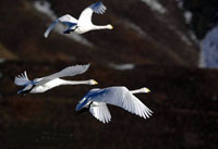 Three swans hover above the Wulapo reservoir in the suburbs of Urumchi, capital of northwest China's Xinjiang Uygur Autonomous Region Dec. 11, 2003.