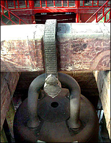 The Yongle Bell weighs 46 tons. Such a huge bronze bell has been suspended steadily from wooden beams for hundreds of years. This convincingly attests the consummate skills and scientific design of Chinese craftsmen in ancient times. In order to support the heavy bell, three tiers of beams were overlapped so that the weight carried by the main beam was shared by ten cross sections and the load born by eight pillars could keep constant value by and large even in an earthquake. Careful visitors will find that the eight gigantic pillars decorated with gilded dragon patterns slant towards the inner side of the beams of the bell. Termed "side angle" in traditional Chinese architecture, this design plays an important role in resisting any wobble of the beams of the bell and preventing the separation of the mortise and the tenon. In 1976 when the grave earthquake in Tangshan spread to Beijing, staff members of the temple found that a tiny gap between the mortise and the tenon at the northeastern corner of the beams of the bell had been filled abruptly with the quake of the earth.