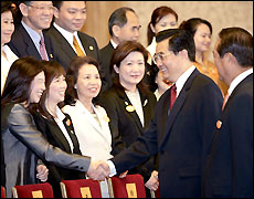 | General Secretary of the Communist Party of China Central Committee Hu Jintao (R.) shakes hands with Soong at the Great Hall of the People, Beijing on May 12, 2005. |