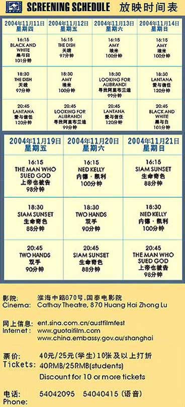 The Australian Consulate General in Shanghai will present nine Australian films during the ten-day festival; including Looking for Alibrandi, Lantana, Ned Kelly, The Dish, Amy, The Man Who Sued God, Siam Sunset, Black and White and Two Hands.
