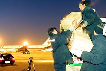Rescuing goods is loaded at the Beijing Capital International Airport on December 28. China will provide over 21 million yuan (US$2.6 million) in aid for victims in Asian countries hit by the massive earthquake and devastating tsunami.