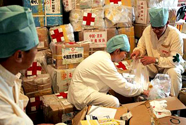 Chinese health care professionals dole out medine in Hikkaduwa, Sri Lanka, on Jan. 8 as a three-member team from Macau arrived to offer aid in the tsunami-hit region.