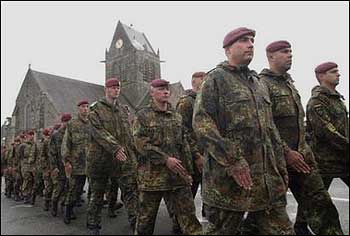 German parachutists walk past the church at Sainte-Mere-Eglise, northern France, June 5, 2005, during ceremonies to commemorate the Allied D-Day landings of World War II. (China Daily/AP Photo)