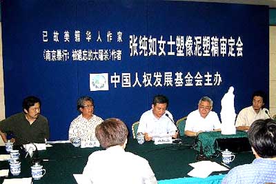 China will make two statues for Iris Chang, the late former female reporter of the Associated Press, for her exposure of "atrocities committed by Japanese aggressors" in China and the spirit to "dig up the historical truth." A group of eminent Chinese artists and scholars discuss the clay model of the work in Beijing June 21, 2005. Chang published her book The Rape of Nanking - The Forgotten Holocaust of World War II in 1997, which enabled Europeans and Americans to know the details of the Nanjing Massacre for the first time. She was also considered a key member in retrieving Diaries of John Rabe, which provides crucial records of the Nanjing Massacre. Chang was found dead of suicide in San Francisco at age 36 on November 9, 2004. (Xinhua photos)