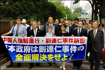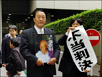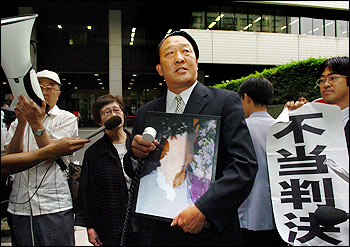 Liu Huanxin, son of late Chinese forced laborer in Japan Liu Lianren, holds his father's photo to protest against the Tokyo High Court's verdict in Tokyo June 23, 2005. The Tokyo High Court on Thursday denied compensation to the family of Liu Lianren who escaped from a work site toward the close of World War II and hid in mountains for about 13 years unaware the war had ended. (Xinhua photos)