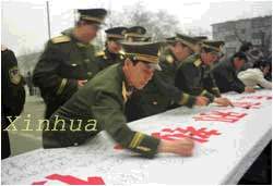 Soldiers in east China's Hebei Province expressed their indignation at the crimes committed by the Falun Gong cult. They are determined to do a good job and maintain social security and stability, while condemning the Falun Gong cult. The photo shows soldiers signing on a scroll with Chinese characters reading "Oppose the cult and safeguard human rights".