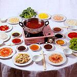 Ingredients: 150 grams (0.33 lb) chicken breast 100 grams (0.22 lb) tender beef 100 grams (0.22 lb) fish meat 100 grams (0.22 lb) shelled shrimp 100 grams (0.22 lb) pork 100 grams (0.22 lb) fresh scallops 100 grams (0.22 lb) green vegetable 100 grams (0.22 lb) bean threads 100 grams (0.22 lb) bean curd 100 grams (0.22 lb) lettuce 100 grams (0.22 lb) Chinese cabbage 10 pieces red chili 3 grams (1/2 tsp) salt 2 grams (1/2 tsp) MSG 5 grams (1/6 oz) finely cut scallions 51,000 grams 94 cups) chicken soup 15 grams (1/2 oz) dried shrimp 50 grams (3 tbsp) cooking oil Peanut butter Soy sauce Sesame oil Kitchup Chili Paste Sweet Bean paste Pickled leek flowers