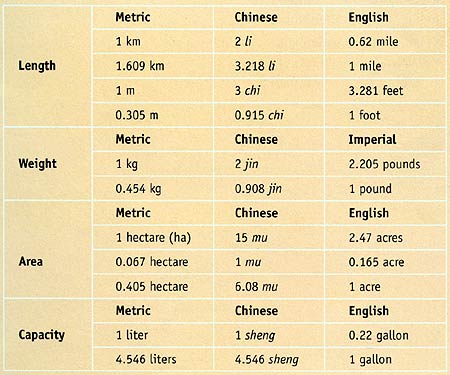 China uses the metric system in weights and measures, and its earlier system is still widely used in some areas. The following is a conversion table.