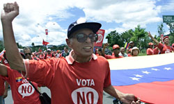 Slogans on the demonstrators' banners, T-shirts and caps urged Venezuelans to "Vote No" to oppose the recall of the firebrand president, who was comfortably re-elected in 2000.