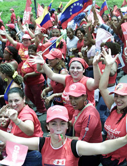 Wearing red, the symbol of Chavez's self-styled revolution, the president's supporters overflowed a central avenue in Caracas. Many were bused in from outside the capital.