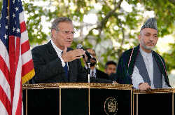 US Secretary of Defense Donald Rumsfeld Wednesday showed his support to Afghanistan's incumbent President Hamid Karzai during his one day visit in Kabul ahead of the first-ever Presidential Election slated for Oct. 9.