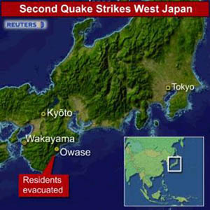 An earthquake measuring 7.4 on the Richter scale shook western Japan on Sunday, the second strong quake to hit the area in five hours, forcing hundreds to evacuate as quake-generated tsunami waves approached.