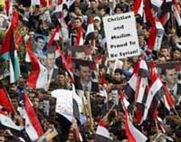 Holding up pictures of their young leader, his late father former President Hafez al-Assad and head of the Lebanese Hezbollah group Hassan Nasrallah, demonstrators pledged to stand by Lebanon and denounced foreign pressures on Syria.